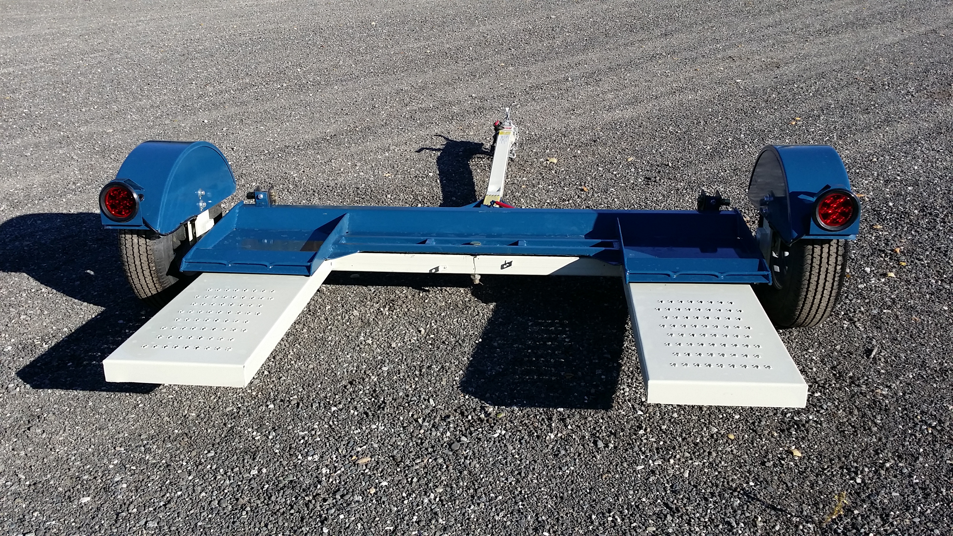 Car Dolly w/ Electric Brakes // GVWR: 2,990 lbs. // Weight: 580 lbs. // Payload: 4,900 lbs. // 2" Ball // 7-way RV plug Tube steel straight tongue, (1) 3,500 lb. axle w/ e-z lube hubs, electric brakes, steel smooth fenders, LED lights, no jack, steering carrying pan that smoothly swivels on maintenance free polyethylene pads, carrying pan w/ built-in 2-1/2" ramps that tilt rearward, comes w/ tire straps & wrench, 1 strap per wheel (straps are rated to 10,000 lbs. each), 14" radial tires, ST205/75R14, 6-ply or load range C, 5on4.5" lug pattern The vehicle must: 1) weigh less than 4,900 lbs., 2) be front-wheel drive [unless MFG states otherwise] and 3) have an outside tire width no greater than 80"